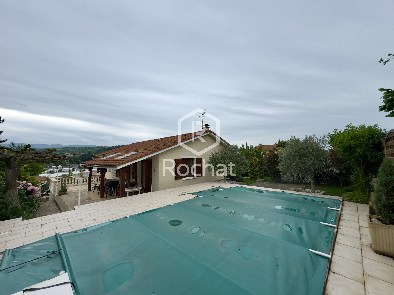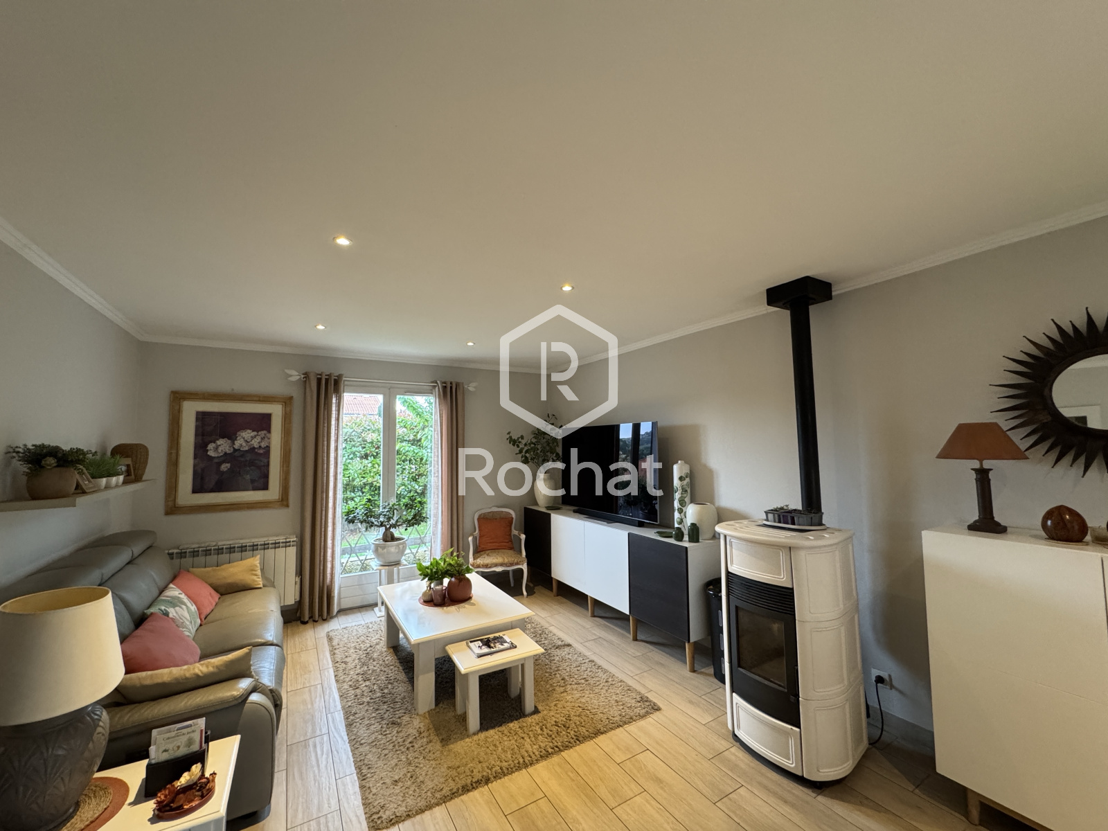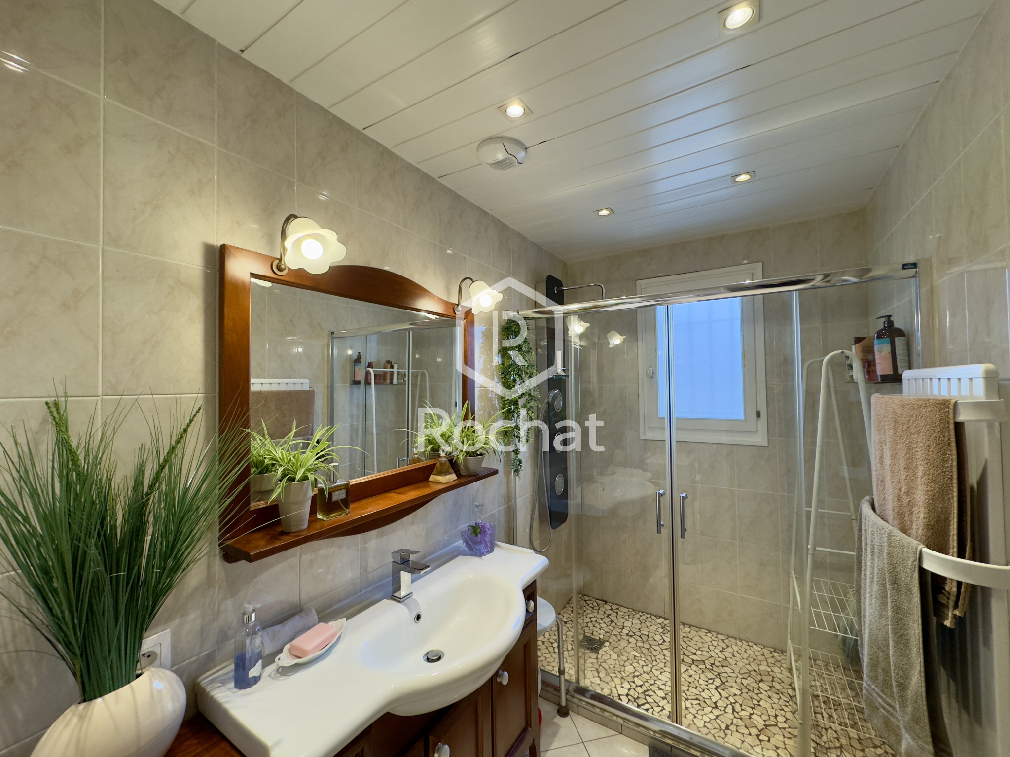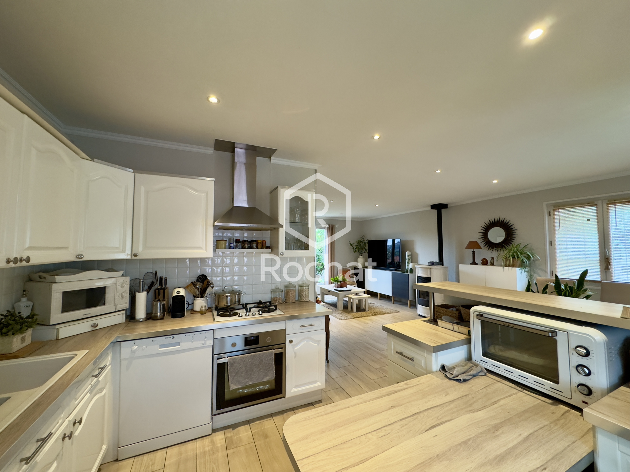 À l’extérieur, vous apprécierez une terrasse ensoleillée donnant sur un jardin paysager avec piscine, idéal pour les beaux jours. Un grand espace garage complète l’ensemble, offrant de belles capacités de rangement ou d’aménagement selon les besoins futurs.