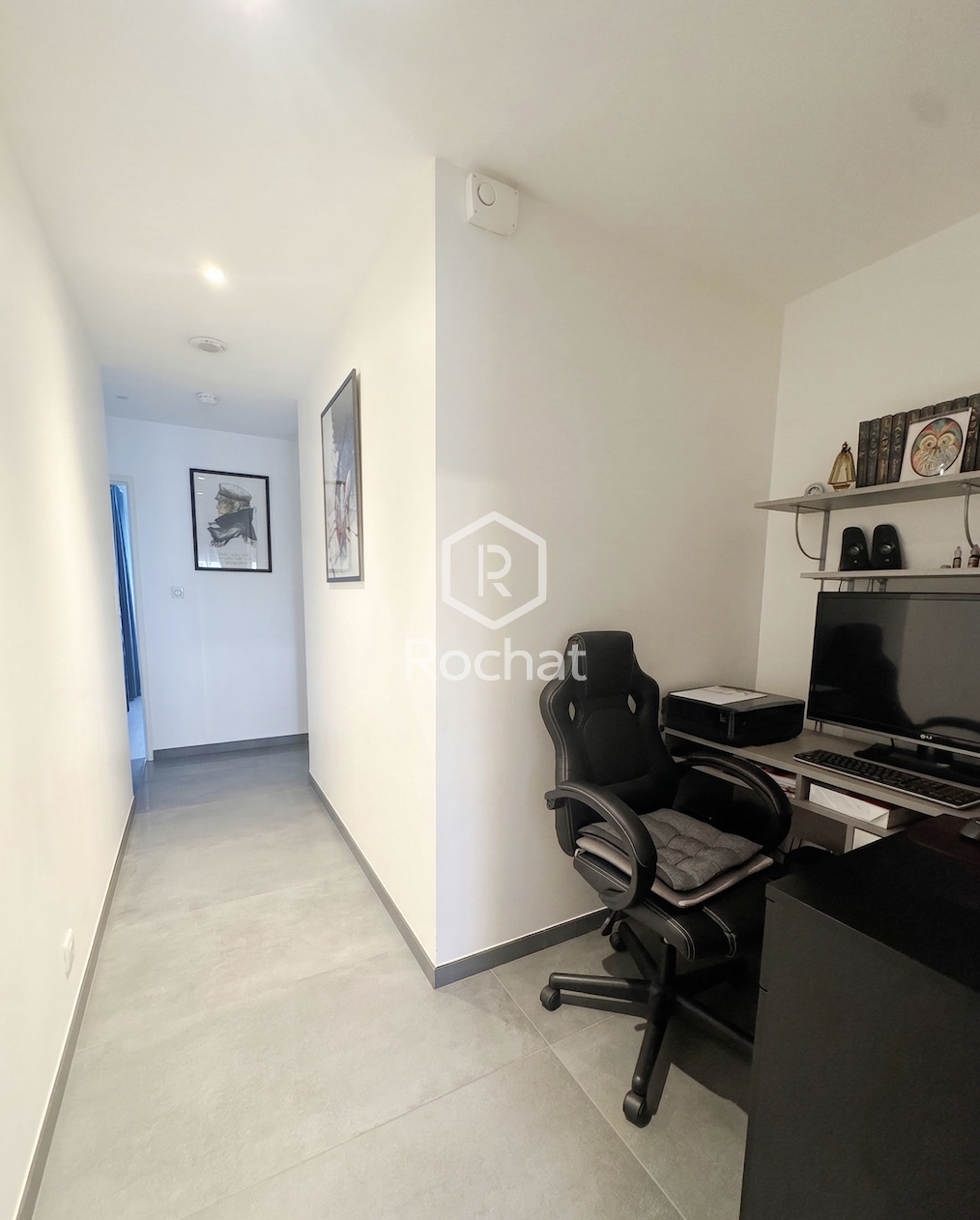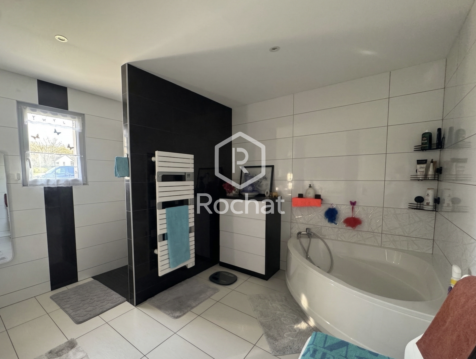 L’espace nuit est distribué par un couloir menant à trois chambres avec placards intégrés, d’une surface comprise entre 12 et 14 m². Une salle de bains spacieuse complète l’ensemble, équipée d’une douche à l’italienne, d’une baignoire et d’un meuble double vasque. Une buanderie ainsi qu’un WC indépendant viennent parfaire l’agencement intérieur.