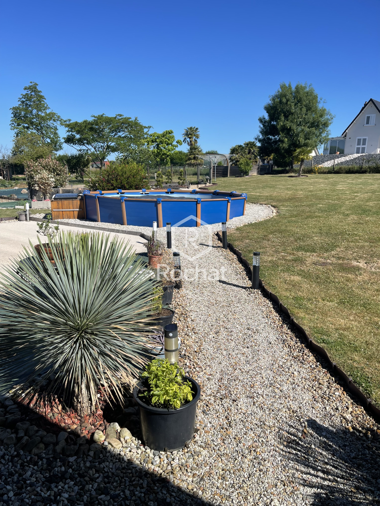 Implantée sur un terrain entièrement clos de 2 403 m², la propriété dispose également d’un garage double, d’un atelier, d’un grenier aménagé, ainsi que d’une piscine semi-enterrée. Une cour gravillonnée facilite l’accès et le stationnement.