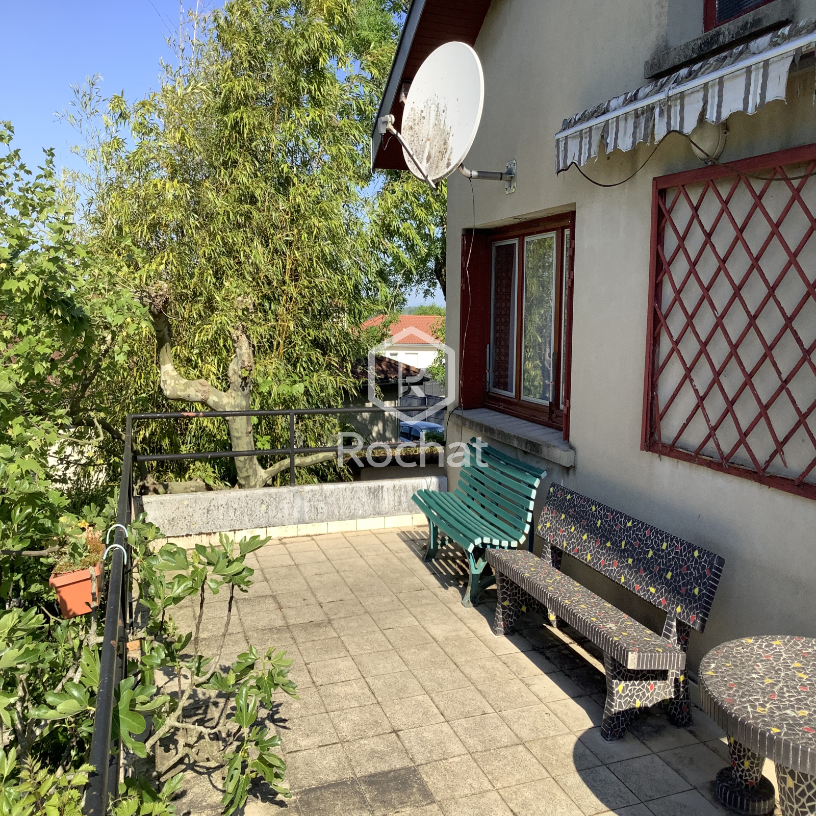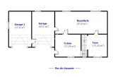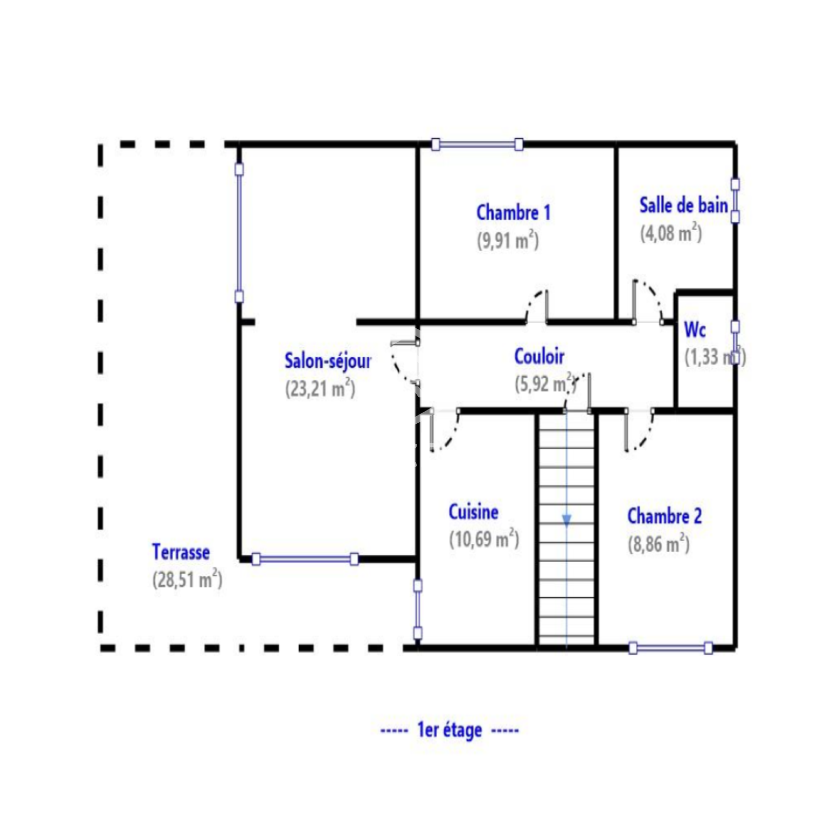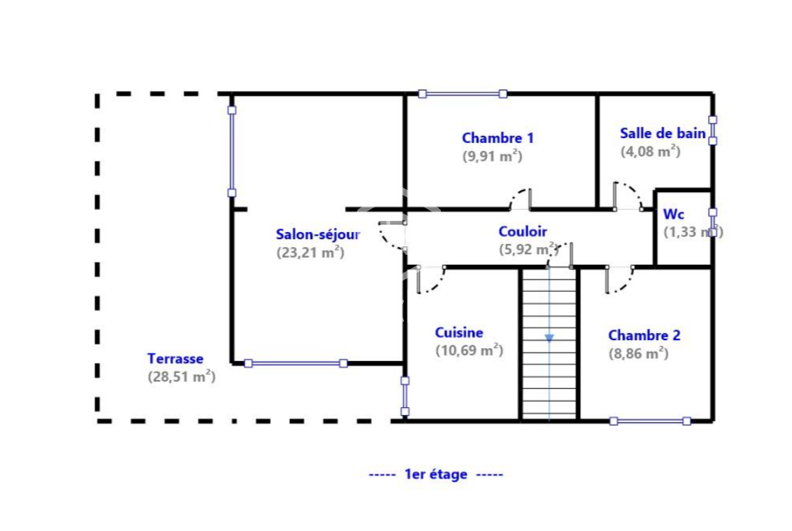 - au deuxième niveau, un couloir distribue deux chambres, un séjour de 23 m² donnant sur une terrasse de 28.5 m², une cuisine,une salle de bain et un WC .