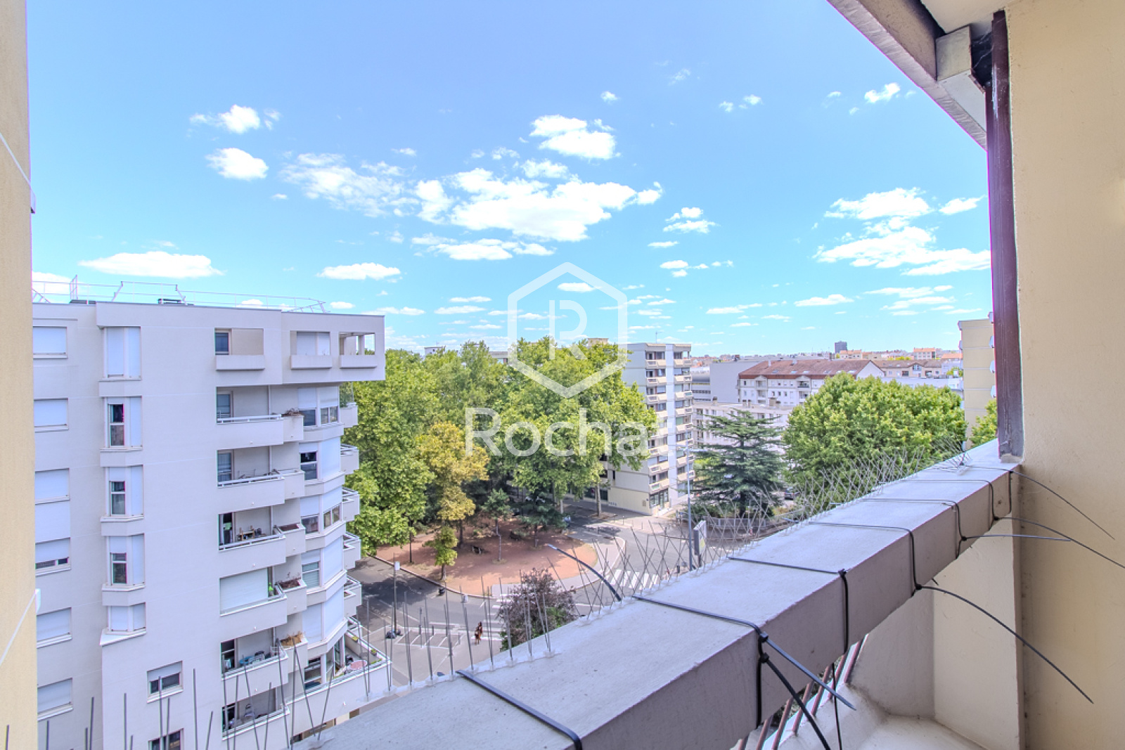 Entrée desservant un vaste séjour ouvrant sur le balcon, cuisine américaine 7,38 m², salle de bains spacieuse et WC indépendant. Belle luminosité au 7e étage, vue dégagée, résidence entretenue avec ascenseur. Environnement pratique : transports (métro B, trams T1/T3/T4, bus), gare Part-Dieu et commerces à proximité immédiate