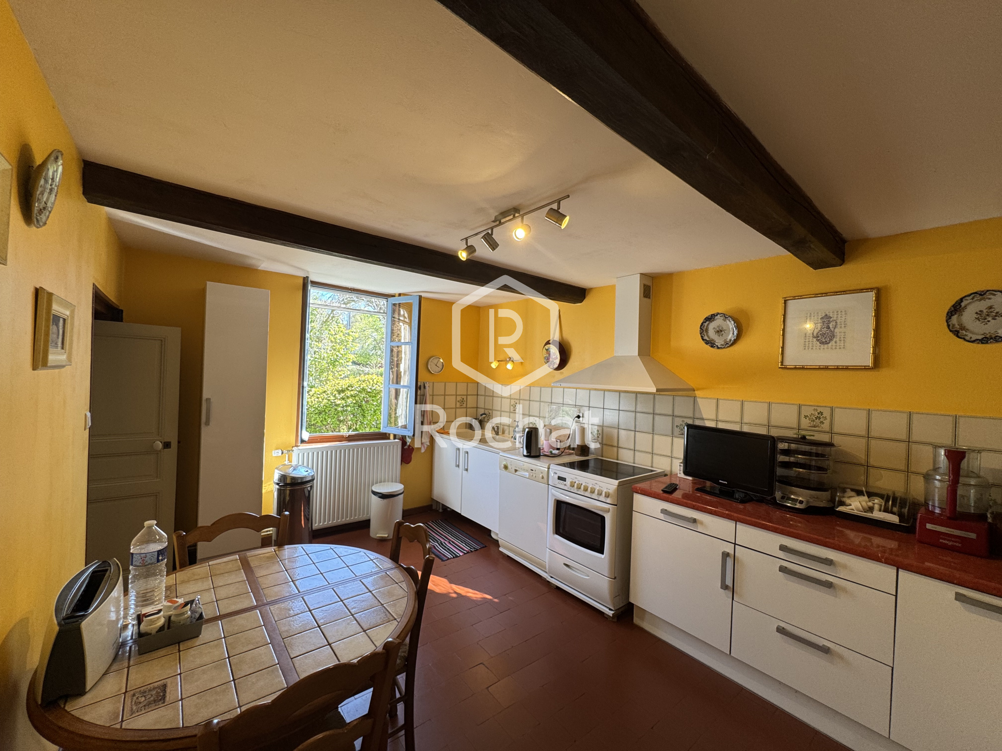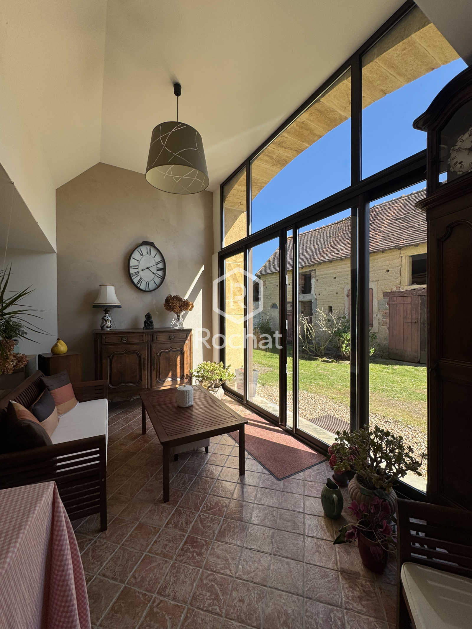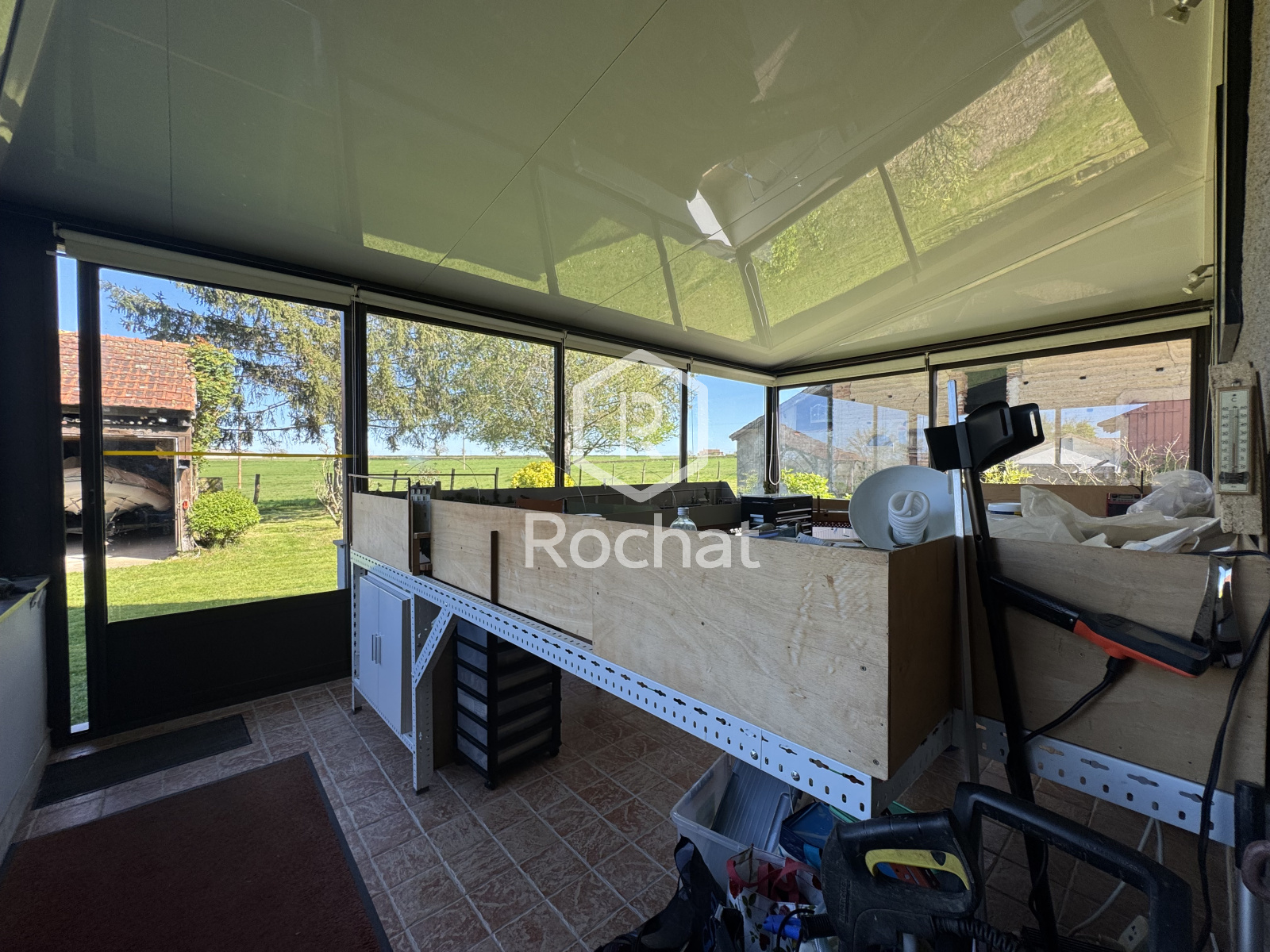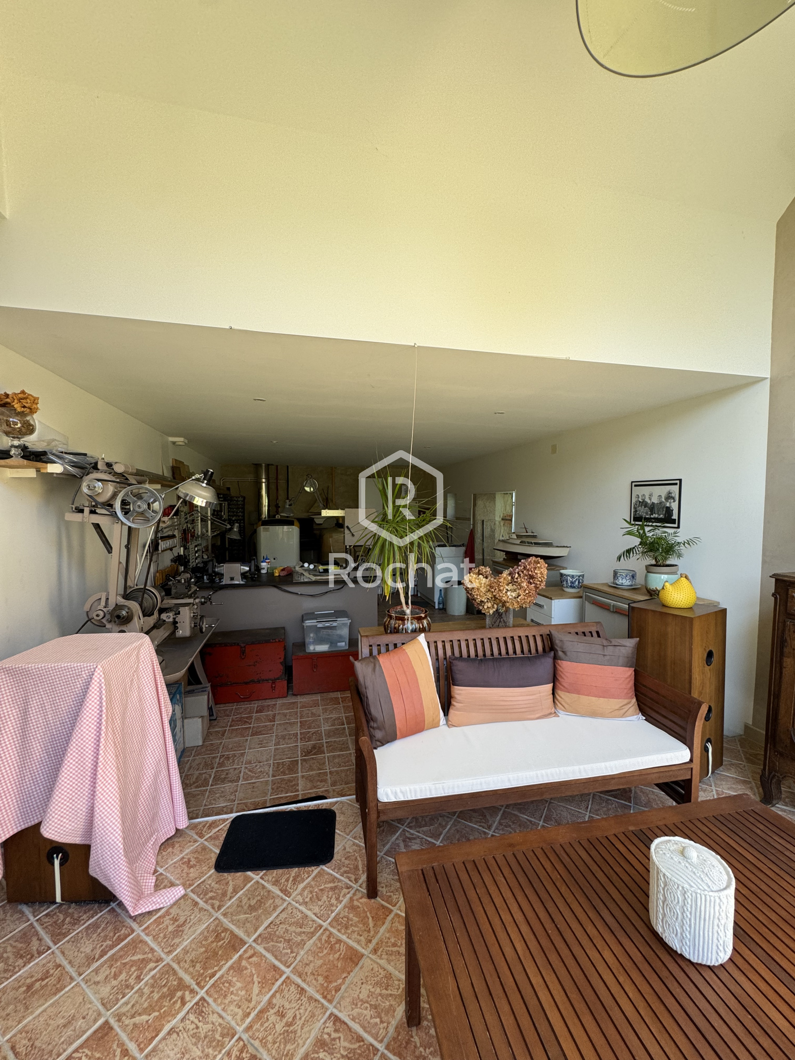 - d'un rez de chaussée fonctionnel et chaleureux : une cuisine séparée, meublée et équipée, parfaite pour les repas du quotidien, un séjour lumineux au charme authentique avec carrelage des année 30 et cheminée en pierre équipée d'un poêle à bois pour une ambiance chaleureuse, une chambre avec placards, une salle de bain (baignoire et vasque lavabo) et WC indépendant complètent cet espace. Vous profiterez également d'un grand espace atelier (40m2) avec une belle baie vitrée et d'une véranda (avec chauffage) de 20m2 avec vue sur les extérieurs sans vis à vis.